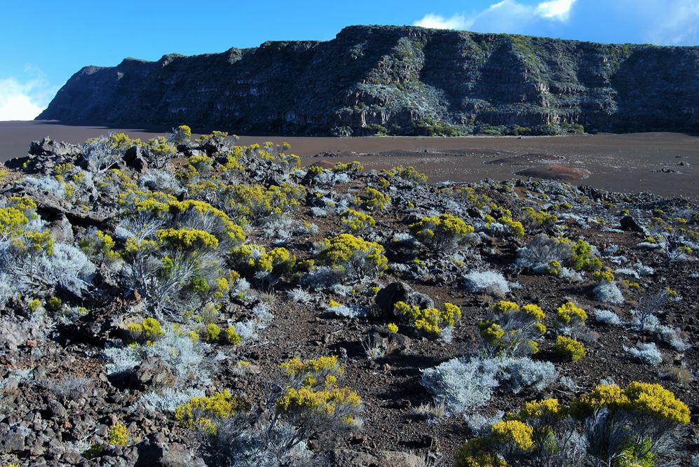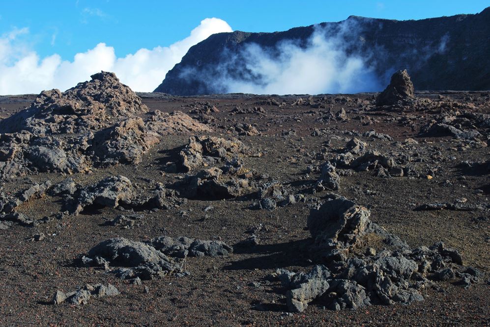 La vue plongeante sur cette immense cuvette de cendres aux tons successivement noirs, rouges et ocres est sidérante. C’est la Plaine des Sables, fièrement dominée par le maître des lieux : le Piton de la Fournaise. Le guide du Routard a trouvé les bons mots pour décrire ce site en le qualifiant de « piste d’atterrissage pour Martiens ».