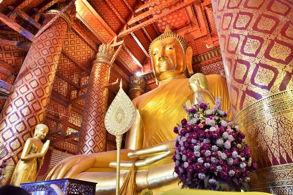 Le Wihan Phra Mongkhon Bophit est notamment réputé pour abriter un superbe bouddha doré, haut d’une dizaine de mètres.