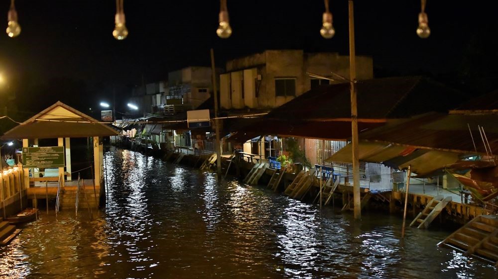 Le gérant nous a réservé un accueil exceptionnel, nous emmenant même gratuitement dans sa voiture passer la soirée dans un petit marché nocturne très vivant et vide de touristes (juste à côté du Mae Klong Railway Market), situé à quinze minutes de route de l’hôtel.