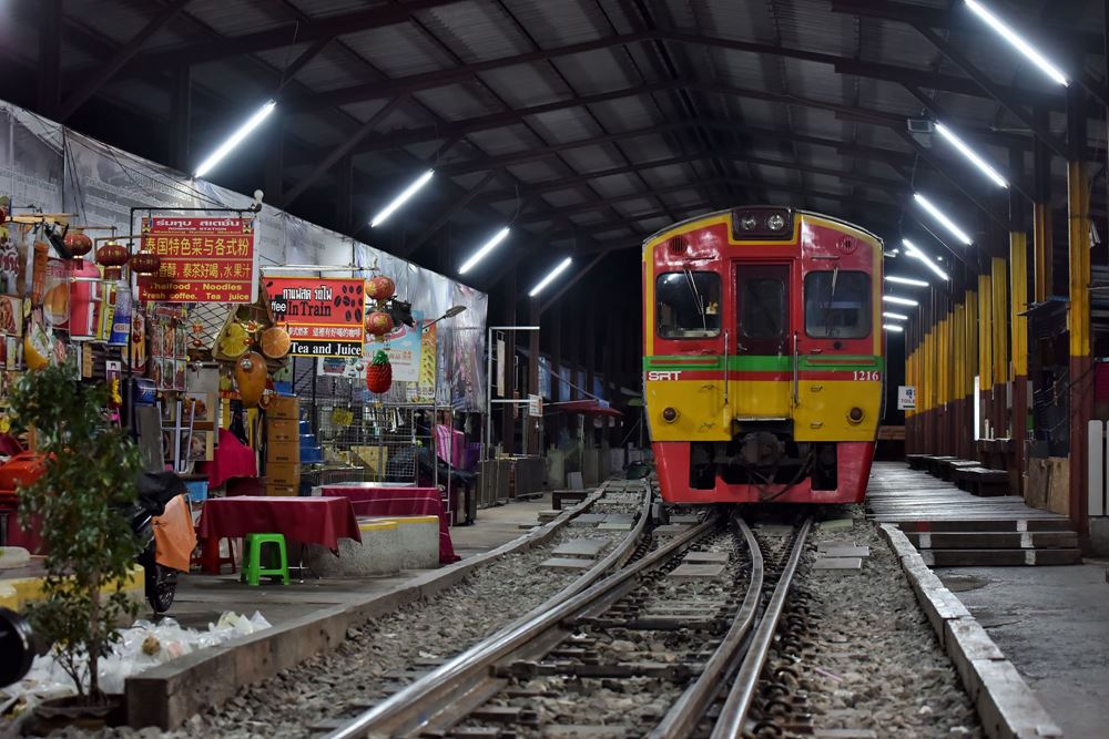 Le fameux Mae Klong Railway Market dispose de quelques étals qui continuent à accueillir le client le soir.