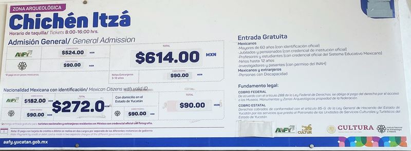 • Le prix : 344 pesos (19 euros). La spécificité de Calakmul, c’est qu’on paye en trois fois ! Ne soyez donc pas étonnés. Voici comment le prix total d’accès au site se décompose (tarifs 2023) :