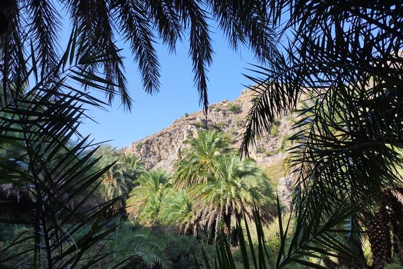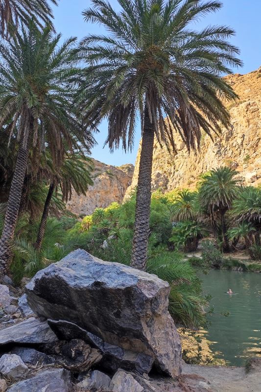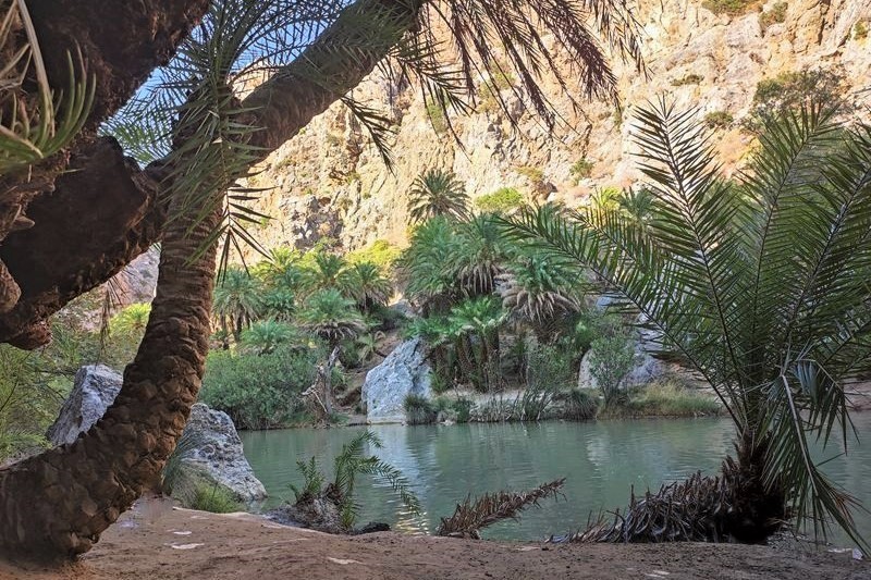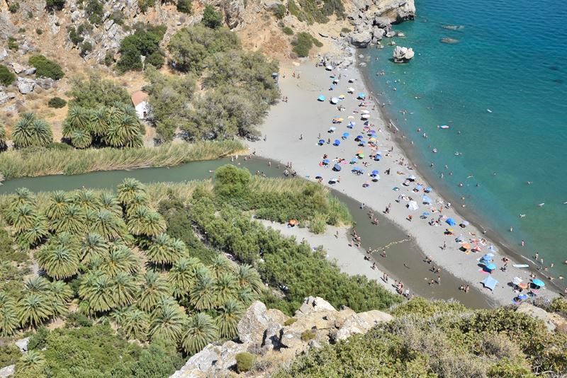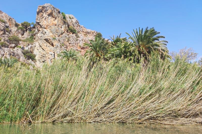 Les palmiers prospèrent sur les deux rives de la rivière Megalopotamos, laquelle vient jusqu’à cette plage pour se jeter dans la mer, après avoir serpenté sur des kilomètres au fond des gorges de Kourtaliotiko.