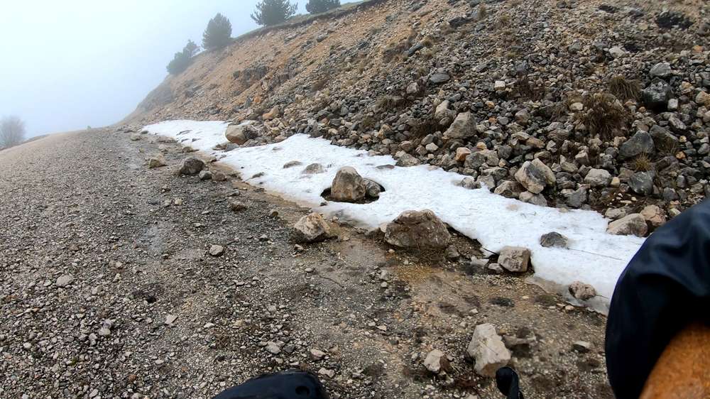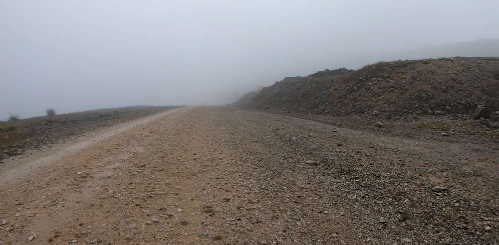 Quand mon GPS m’indique enfin que je vais rejoindre la route, la réalité s’avère tout autre : il n’y a pas le moindre bitume autour de moi, juste ce tortionnaire de petit chemin qui continue encore et toujours à perte de vue derrière l’horizon. Il serpente à travers la montagne puis traverse des bouts de forêts et des plaques de neige. Il fait froid et un brouillard de plus en plus épais m’entoure. Il se lève bien un peu de temps en temps mais le plus souvent, je n’y vois pas grand-chose. Les conditions sont vraiment difficiles et pourtant, je n’ai pas de quoi me plaindre tant que je ne vois aucun ours amaigri après plusieurs mois d’hibernation surgir du bois pour me débouler dessus.