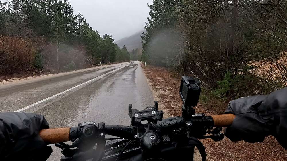 Une poignée de kilomètres plus loin, mon GPS me fait quitter le bitume routier pour un petit chemin sauvage montant dans les cailloux. La journée est l’une des plus pluvieuses depuis le début du périple, le chemin est boueux et ses innombrables pierres particulièrement glissantes. Le GPS m’indique que je vais devoir affronter dix kilomètres de montées, et donc de galères vu la météo exécrable, avant de retrouver enfin une route asphaltée.