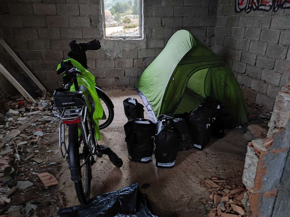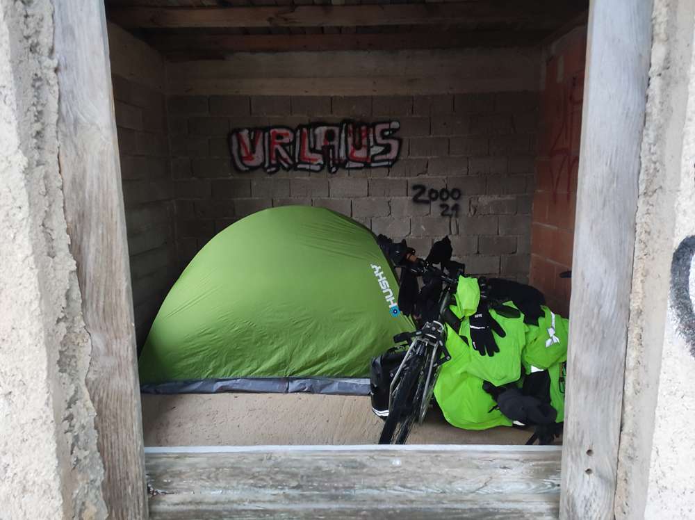 A l’intérieur, il ne fait pas bien chaud avec ce vent fort qui circule, les portes et les fenêtres ayant disparu depuis longtemps. L’avantage de ce gruyère, c’est que l’air qui s’y balade devrait permettre à tous mes vêtements de sécher pendant la nuit. Toujours voir le verre à moitié plein. Pour l’occasion, j’utilise mon vélo polyvalent en mode étendoir.