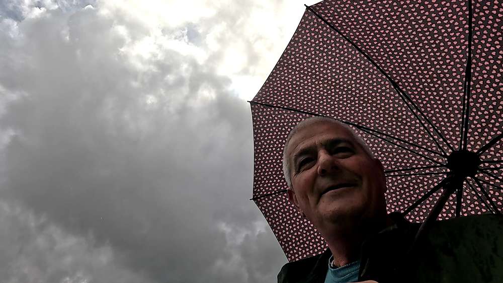 Un homme arrive en effet dans ma direction, abrité sous un parapluie rosâtre qui égaye un peu la grisaille ambiante. Il est accompagné d’un chien qui semble tout content de me voir alors que nous ne nous connaissons pourtant pas.