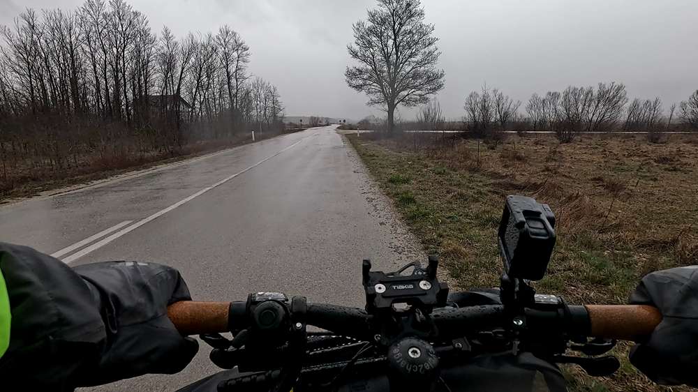 Le temps ne passe pas vite et les kilomètres défilent lentement. De temps en temps, afin de vérifier ma route, j’enlève mes trois paires de gants imbibées pour attraper mon téléphone du bout de mes doigts trempés, ce qui n’arrange pas son problème d’humidité. Mais comme toutes mes affaires sont mouillées, je n’ai aucune possibilité de m’essuyer les mains. Je vérifie juste que je suis toujours sur le bon itinéraire et je range rapidement ce petit appareil qui est désormais mon meilleur ami, à l’intérieur de ma sacoche mi-sèche, mi-humide, et en croisant les doigts qui sont tout fripés.