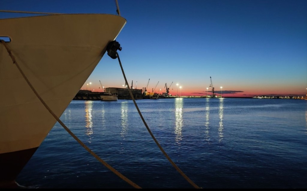Comme je souffre à voix haute, les deux membres d’équipage postés en haut de la passerelle pour accueillir les voyageurs descendent jusqu’à moi. Voulant m’aider, ils me demandent de lâcher le vélo pour le monter eux-mêmes à bord mais ils ne s’attendent pas à ce qu’il soit si lourd. Du coup, ils le font tomber dans les cordages qui bordent la passerelle, et dans lesquels le guidon s’empêtre. Quand ça veut pas…