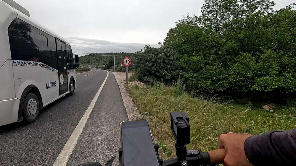 J’arrive assez rapidement sur une quatre-voies. En Turquie, les vélos y sont autorisés, de même que sur les autoroutes. Moi qui suis si attaché aux conditions de sécurité à vélo (par exemple, je fais partie des zéro pour cent de cyclistes environ qui ne grillent pas les feux !), je suis surpris de prendre tant de plaisir à pédaler sur ces routes à grande vitesse. Les voitures foncent, un certain nombre d’entre elles pulvérisant allègrement la limitation à cent dix. Les bus et les poids lourds ne sont pas en reste car ils me doublent également en roulant vite. Leur moteur me hurle dans les oreilles et leur pot d’échappement me crache dans les poumons. Mais malgré tout, comme la bande d’arrêt d’urgence sur laquelle je roule est plutôt large et que je surveille dans mon rétro tous les véhicules en approche, j’ai plutôt tendance à m’éclater ici.