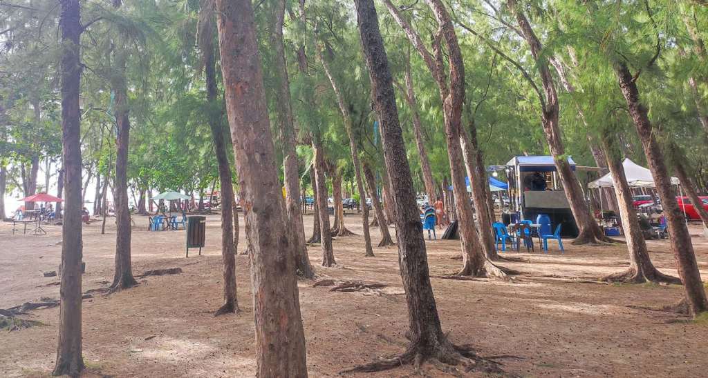 Au niveau pratique, un long parking sous les filaos borde la plage, où l’on trouve des camions qui servent à manger et à boire…