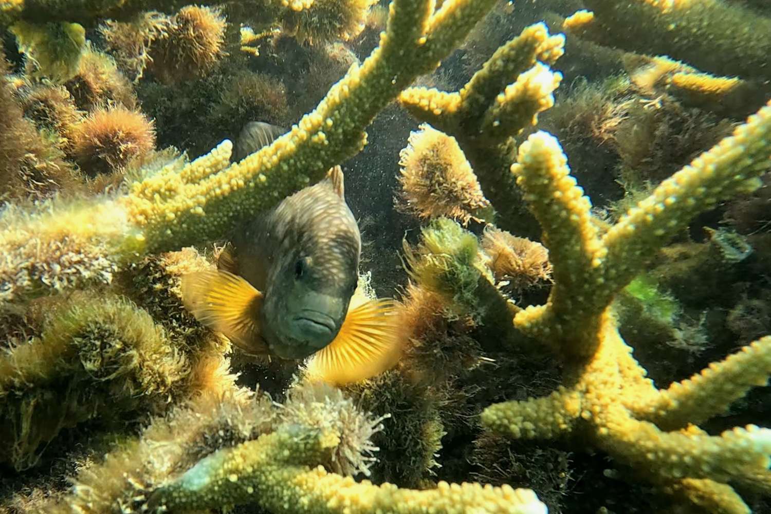 Les coraux sont dans une zone fréquentée et, si certains sont encore colorés, d’autres sont morts.