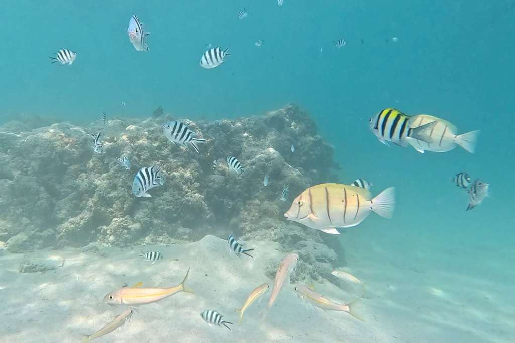 Impossible de descendre en apnée donc, toutefois on aperçoit bon nombre de jolis poissons colorés, typiques des mers tropicales.