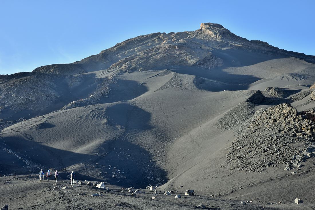Quant au volcan, il nous fait face et il est majestueux. Les quelques randonneurs que nous apercevons loin devant nous sur les pentes du volcan sont loin d’être arrivés en haut et pourtant, ils nous paraissent déjà minuscules. Cela nous fait vite comprendre que le sommet est beaucoup plus éloigné qu’il n’en a l’air. Et le soleil a beau être encore assez bas, il commence déjà à chauffer.