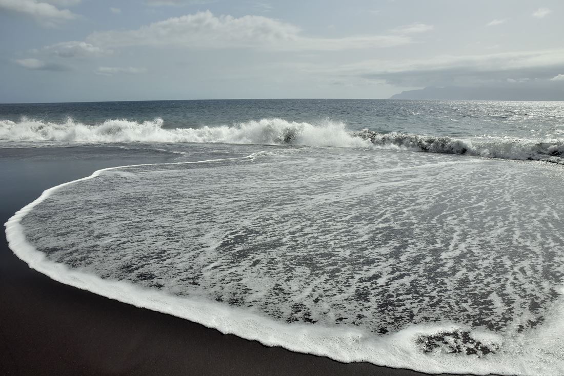 Un peu plus loin, nous dénichons le long escalier qui va nous faire descendre jusqu’à cette fameuse plage de sable noir, laquelle ne peut nier ses origines volcaniques.