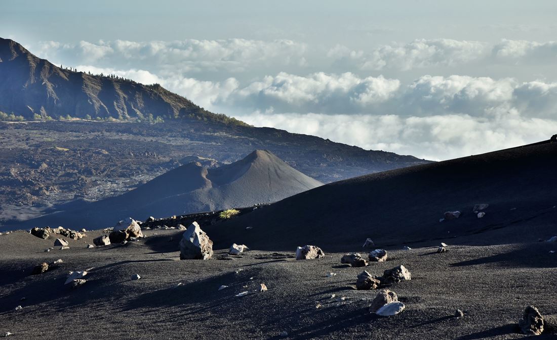 Nous apercevons en contrebas quelques cratères qui ont tous été à l’origine d’éruptions de plus ou moins grande importance depuis le 18e siècle. Derrière eux, les remparts marquent les limites de la caldeira et au-delà, une mer de nuages s’étend à perte de vue au-dessus de l’océan.