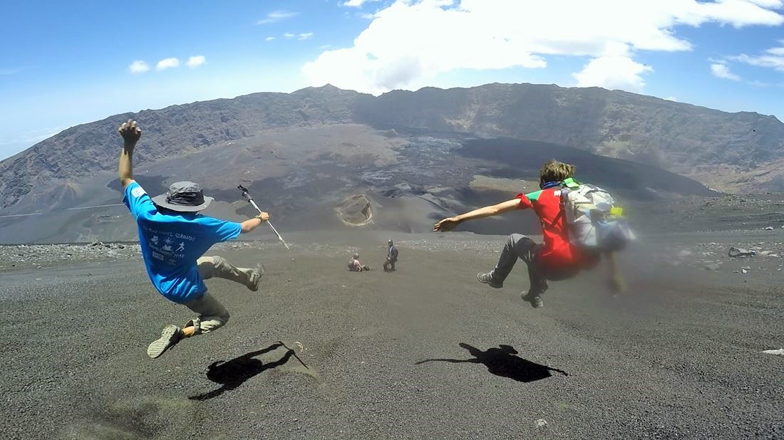 Une fois terminée leur escapade dans les entrailles du volcan, nous commençons le retour tous ensemble en suivant la ligne de crête du cratère. Puis nous descendons dans les rochers pendant quelques dizaines de minutes avant de découvrir la surprise du chef : la descente de la pente du volcan en courant dans la cendre !