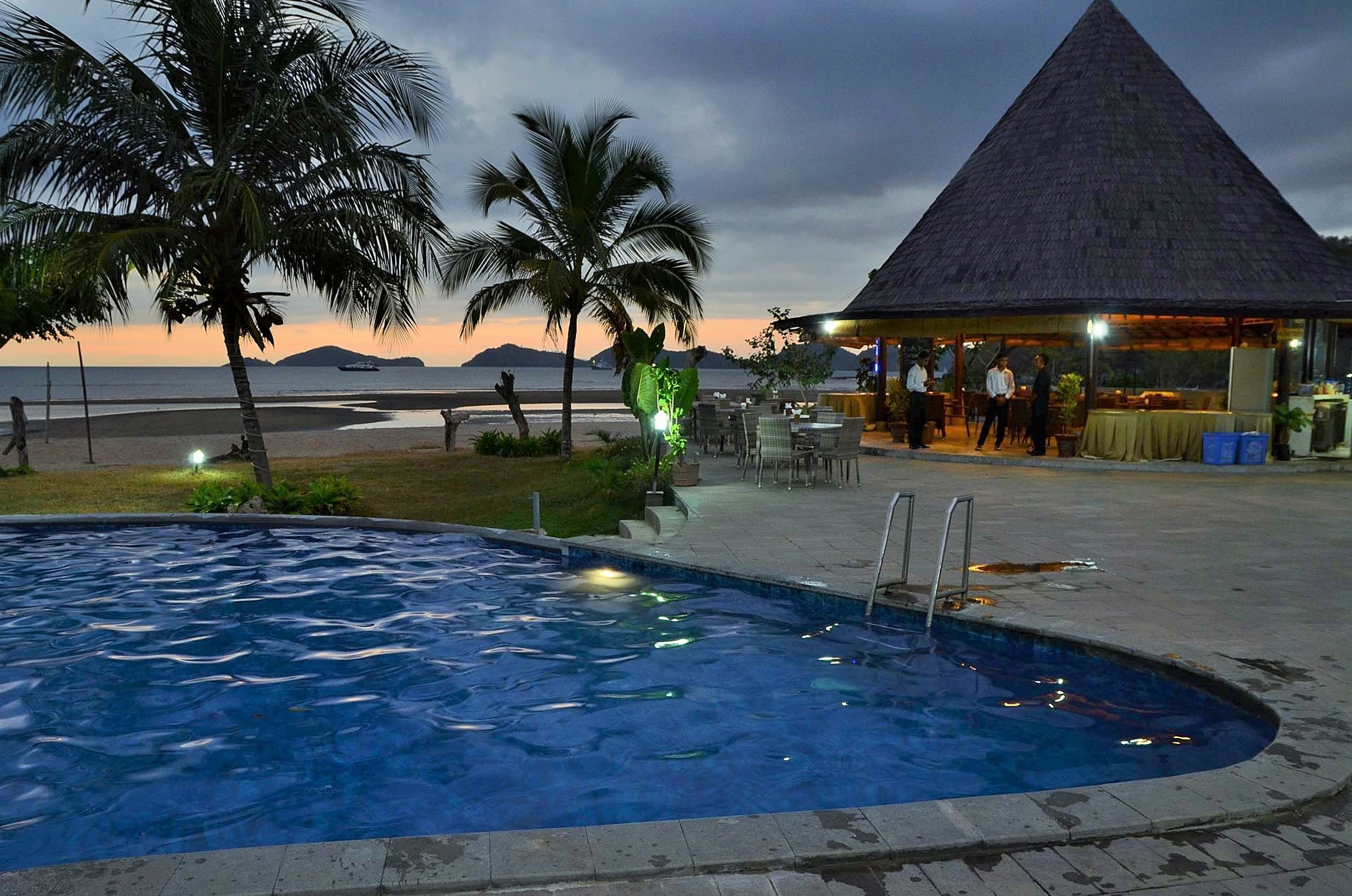 Luwansa Beach Resort Hotel : de 40 à 70 euros la chambre double. C’est l’hôtel que nous avons trouvé à l’arrache lorsque nous nous sommes retrouvés bloqués à Labuan Bajo, à cause de l’éruption du Raung. L’hôtel est très propre, il dispose en théorie du wi-fi (en pratique, la connexion est régulièrement interrompue). Il dispose d’une piscine qui donne sur une longue plage déserte. La zone de restauration extérieure mais couverte par un chapiteau est très agréable, ainsi que le personnel.