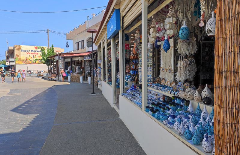 Dans le village, la rue principale qui mène à la plage de Ligaria est bordée de part et d’autre de bars, de restaurants et de boutiques de souvenirs.