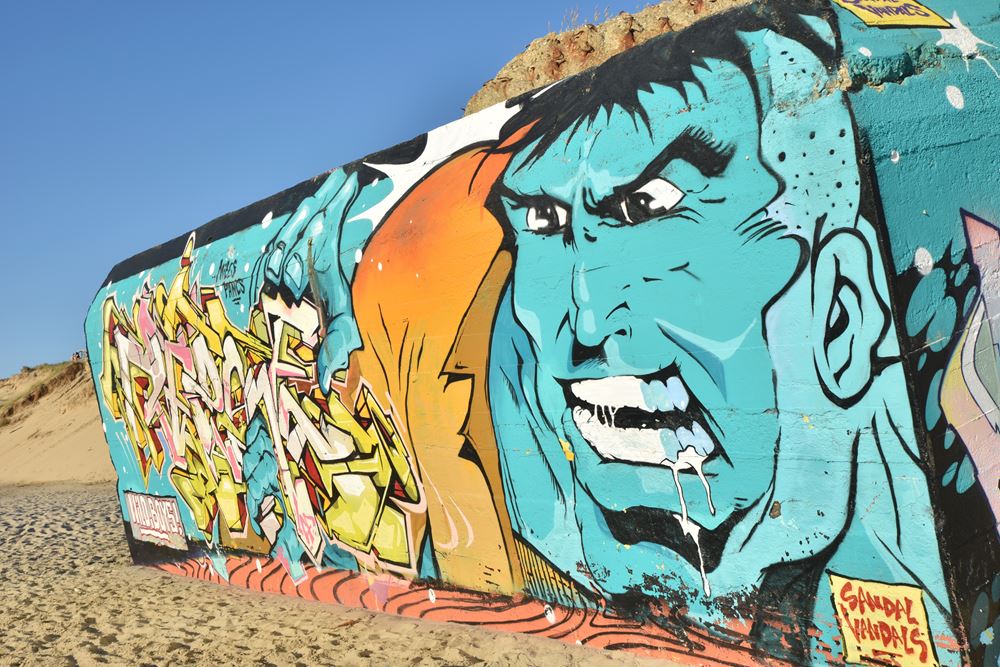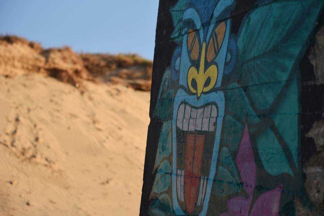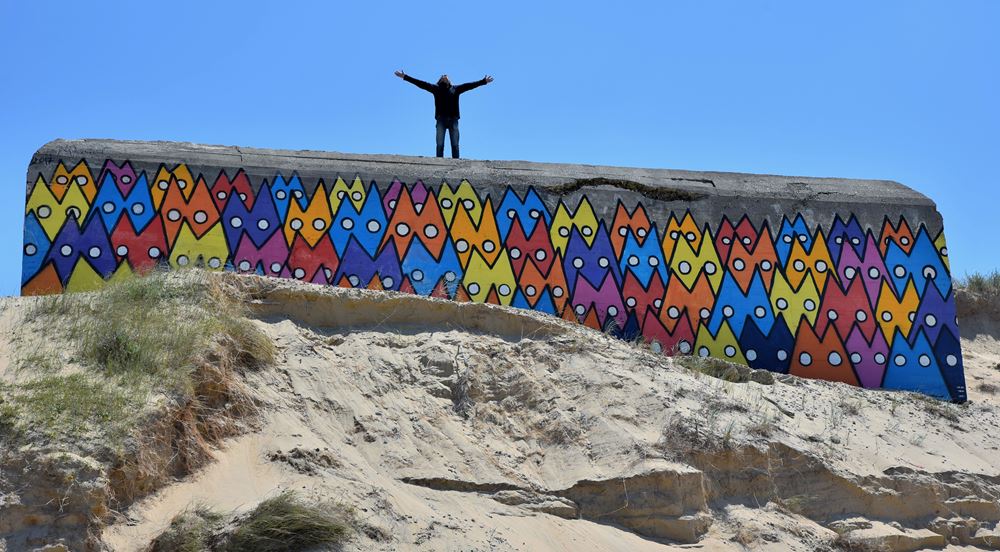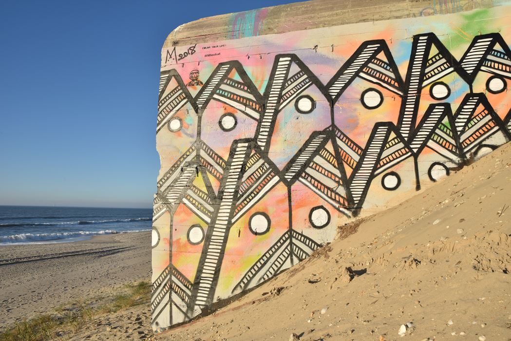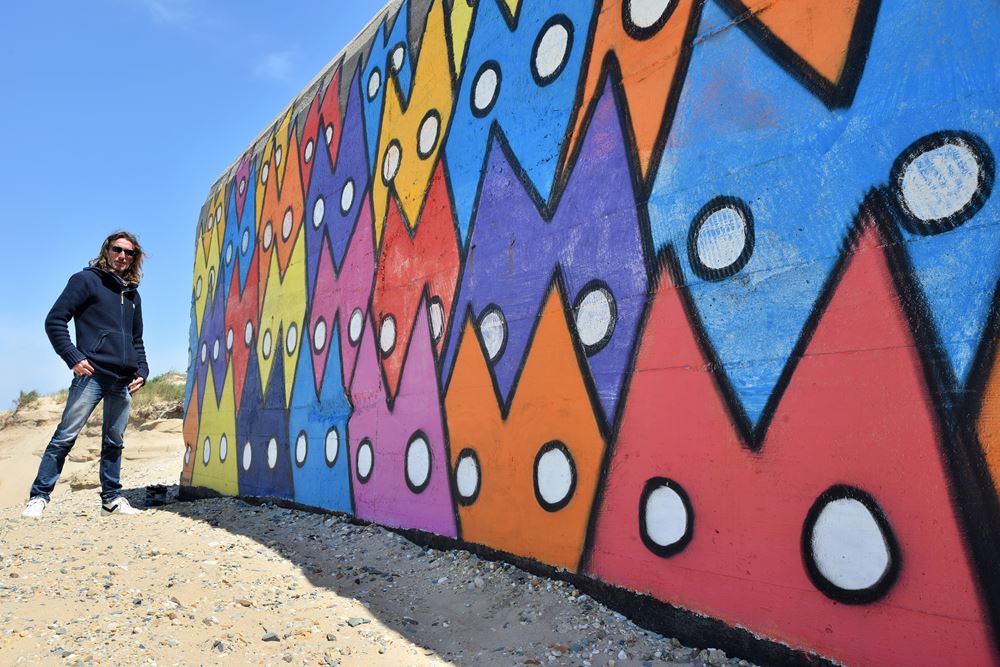 En effet, l’érosion des dunes désensable les blockhaus au fil des années, ce qui a conduit Yann, pour ce bunker-là, à peindre dans un premier temps une troisième rangée de chats en-dessous des deux d’origine, puis récemment une quatrième. En attendant la cinquième dans les années à venir ?…