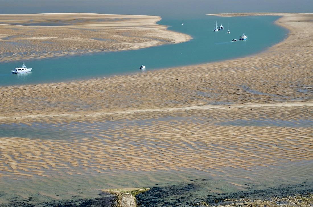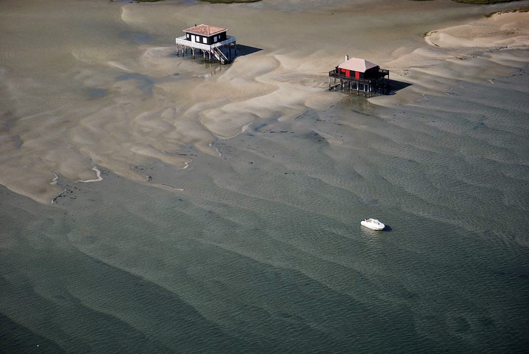 Entre les deux et au milieu de la mer émerge le Banc d’Arguin, ce vaste banc de sable qui barre en partie l’entrée du Bassin. Et en plein milieu de ce dernier se trouve l’Île aux Oiseaux et ses fameuses cabanes tchanquées.