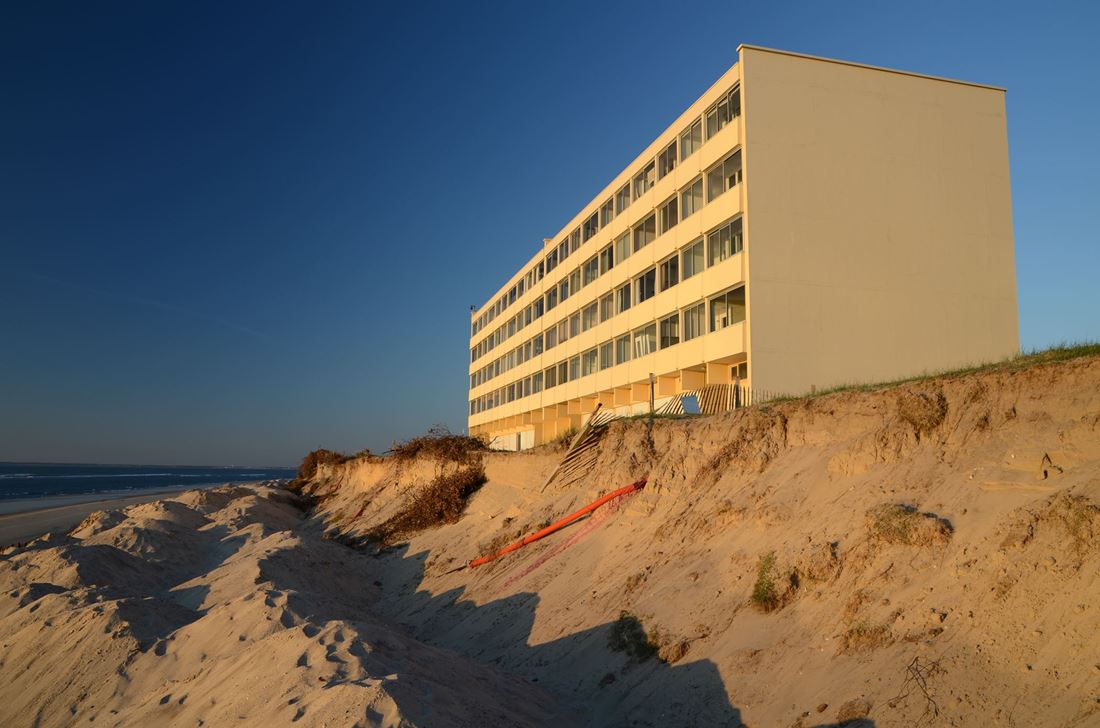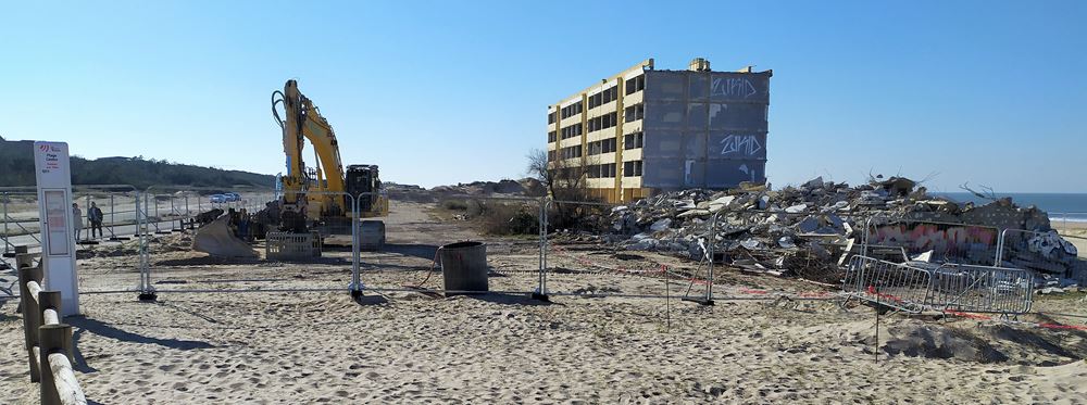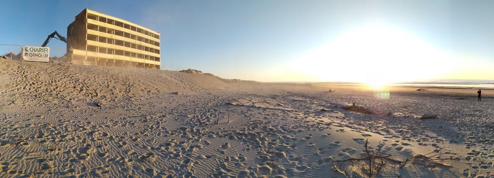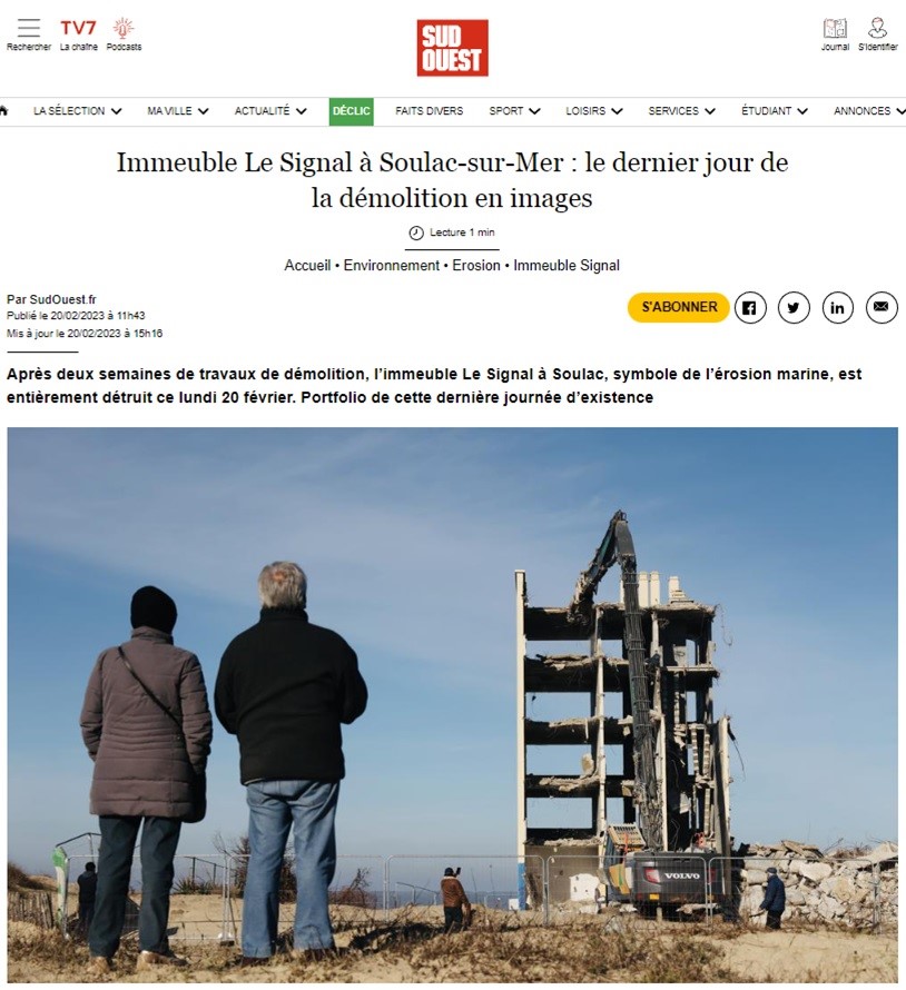 Ici, le bâtiment qui symbolise cette grande question environnementale s’appelle le Signal. Rebaptisé par les Soulacais la verrue (!), ce double bâtiment de 78 appartements, construit dans les années 1960 en bord de mer, menace ruine à cause des assauts permanents de l’Océan sur la dune qui le supporte.