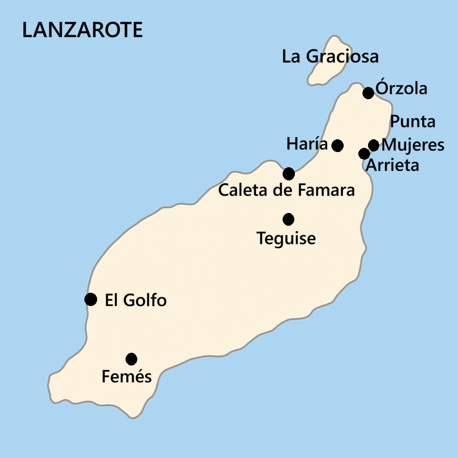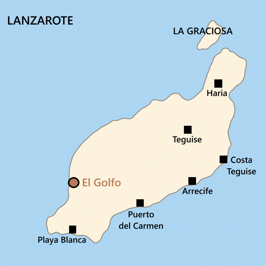 El Golfo est situé dans le sud-ouest de l’île : à 15 minutes de Playa Blanca, à 25 minutes de Puerto del Carmen, à 30 minutes d’Arrecife et de Teguise.